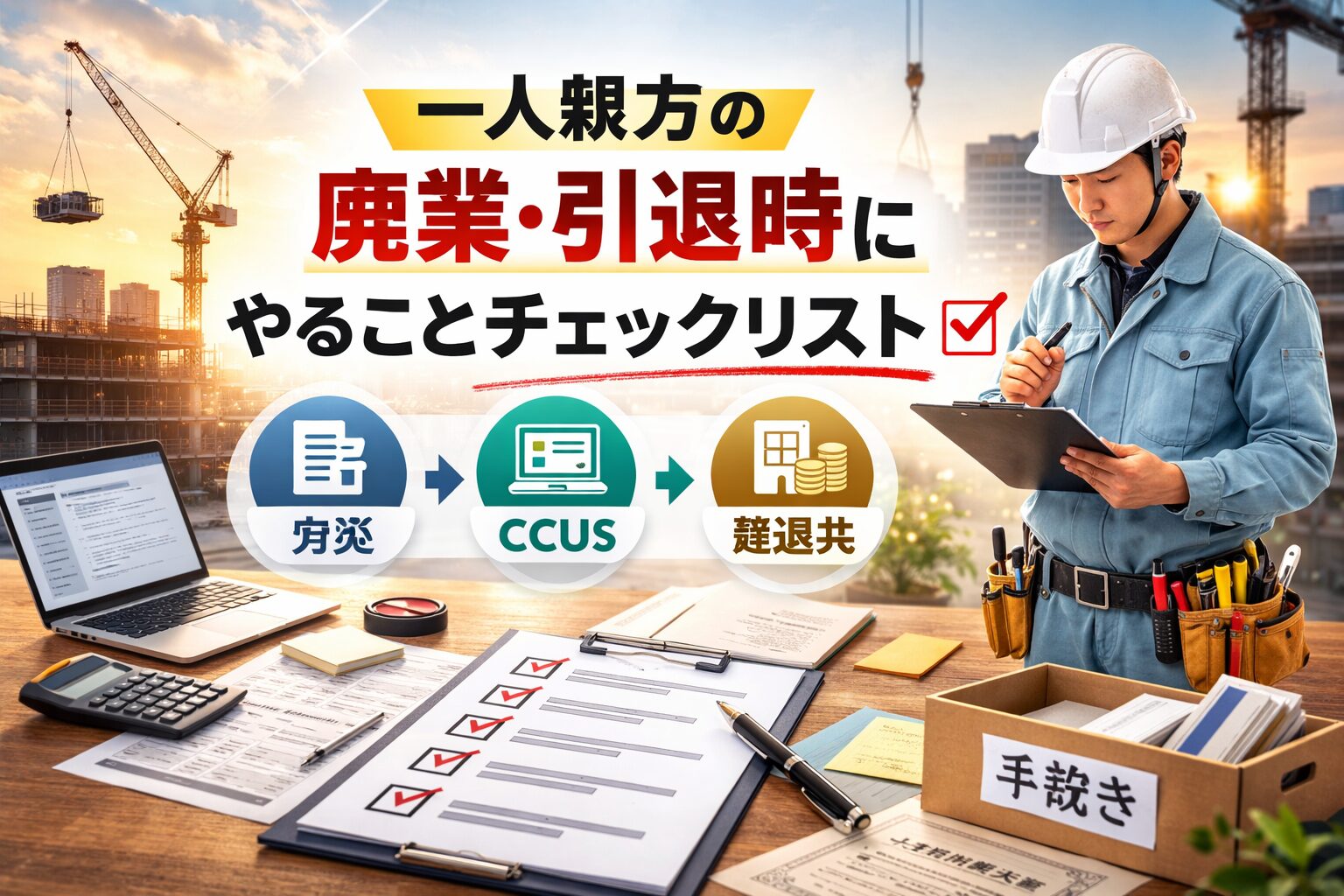 一人親方の廃業・引退時には税務・保険・建退共・CCUSなど多岐にわたる手続きがあります。特に建退共の退職金請求と廃業届の提出期限は見落としやすいので注意しましょう。